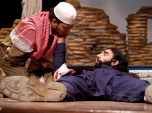 Notes on the scene from director: There is something about showing intimidation by going around this way. Although it violates all stage norms, and is more of a street play style. The actors and crew were apprehensive about delivering their dialogues in this manner and I can understand their doubts… it took a lot of persuasion on my part to let the collective voice listen to mine, but in the end… the result was extraordinary. What would have been nicer, is, if the three women would have worn burqas.. they look like Israilies instead of Afghani’s (feedback from most people who came in to watch the play). Burqa would have had a terribly fantastic effect, what with large volumes of material swaying around… creating ripples. Maybe next audition I will get actors who find it easier to pull off the look.