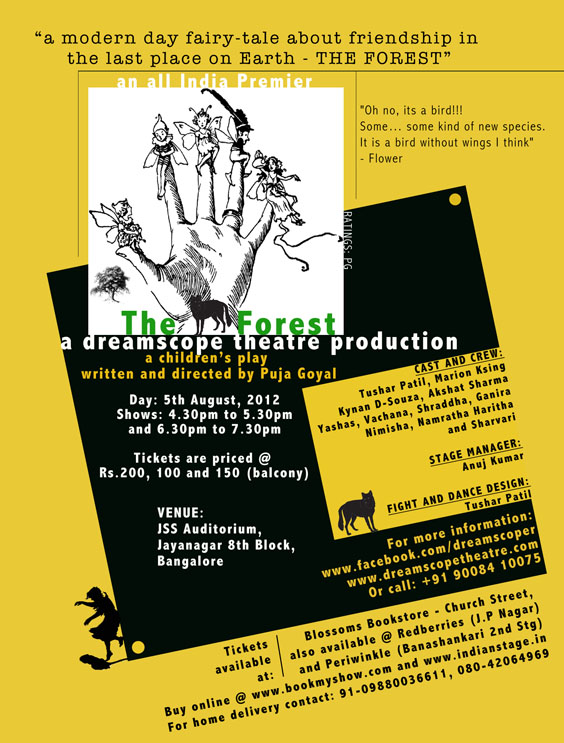 DreamScope Theatre presents an All India Premier of a modern day fairy – tale for children, THE FOREST, written and directed by Puja Goyal. This is the story of the last remains of a place called, THE FOREST. The people in the Forest, called the Foresters believe humans are extinct until they come across a little girl called Mandy who is going to her grandmother’s house. Mandy is fascinated that she can hear, feel and speak to the forest. The Forest is getting ready for the party that the FAIRIE QUEEN is throwing for them. The foresters know that the FAIRIE QUEEN will be angry after seeing her; they know that the Fairie Queen will find a solution for this thing called Mandy, the little human.