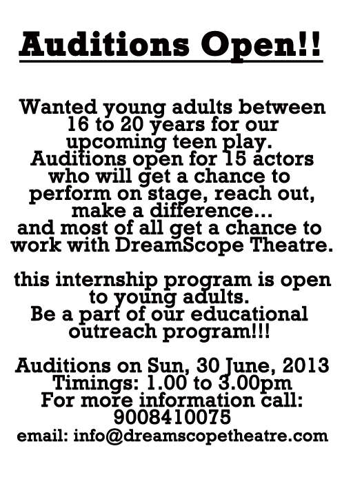 DreamScope Theatre will be staging an action packed teen play in the end of August, 2013. We are calling for young actors to be a part of this wonderful venture. This will be more than a stage play. It will be a community outreach program designed by DreamScope Theatre in order to educate and initiate change through theatre. The actors will be involved in research, rehearsals, and staging of the play and be a group working on their own in many areas of the production, with direction assistance from DreamScope Team.